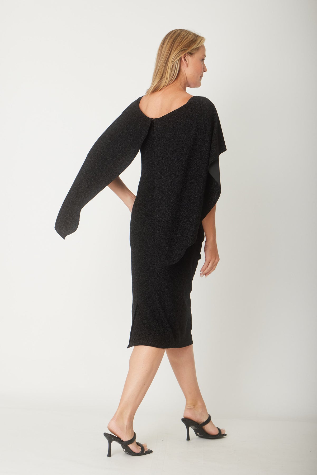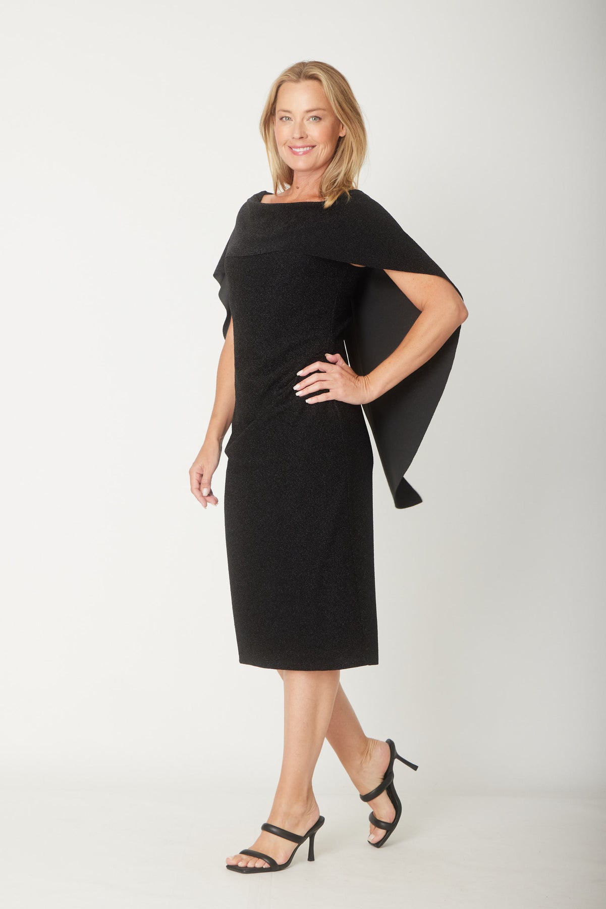 This stretch textured jacquard dress features a flattering vee back with a stylish cowl front, creating an elegant silhouette. The glamorous cape detail adds a sophisticated touch, perfect for making a statement. Designed with a straight, below-knee length cut, it combines comfort and chic style effortlessly for any special occasion.