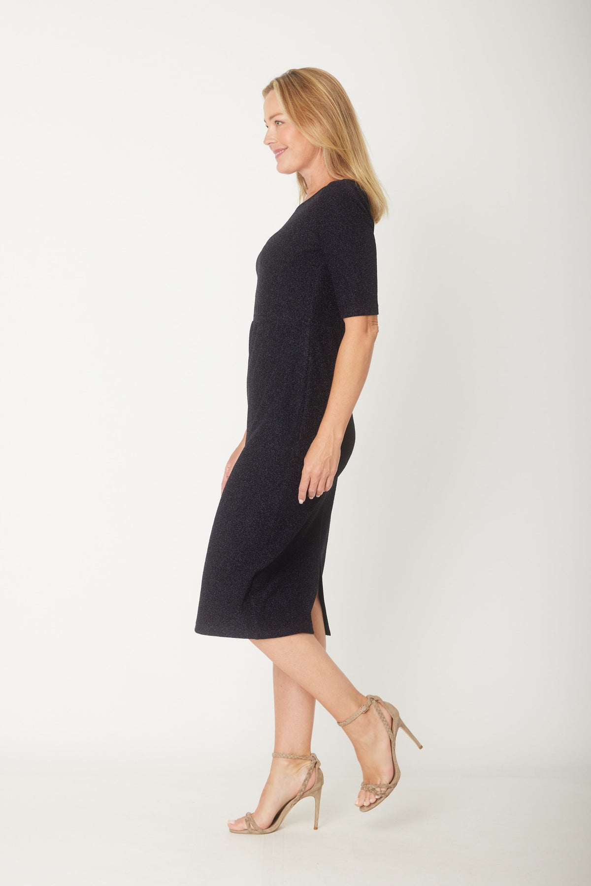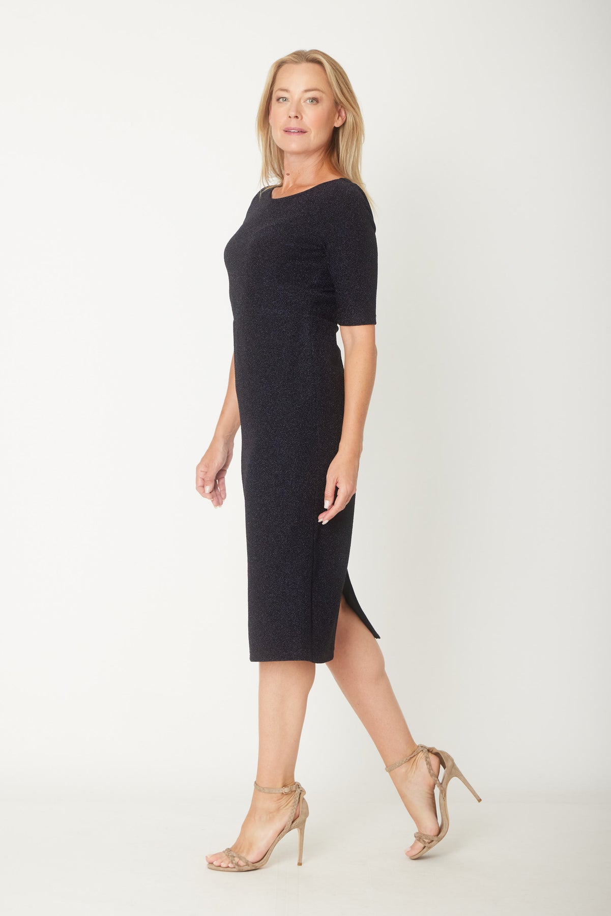 This elegant Lurex Lux Dress is crafted from stretchy, non-scratchy lurex fabric for all-day comfort. Featuring a sophisticated back split and flattering elbow length sleeves, this timeless piece promises to elevate your wardrobe. Invest in a dress designed to remain a favourite for years, perfect for both special occasions and stylish everyday wear. Model is a size 10 wearing a size 10.