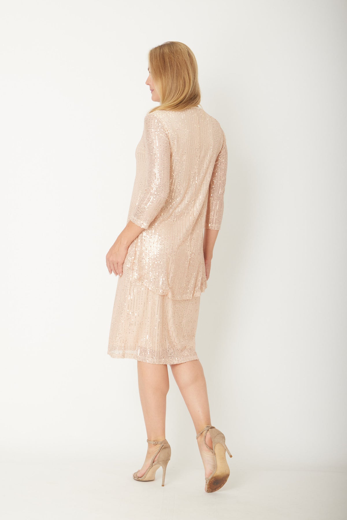 This forgiveness sequin dress features a flattering overlay that gently skims the body, enhancing your silhouette with ease. Fully lined for a smooth finish, it offers sheer 3/4 sleeves and slight stretch, ensuring comfort throughout wear. Designed without zippers, this dress combines elegance and ease, making it perfect for any special occasion.