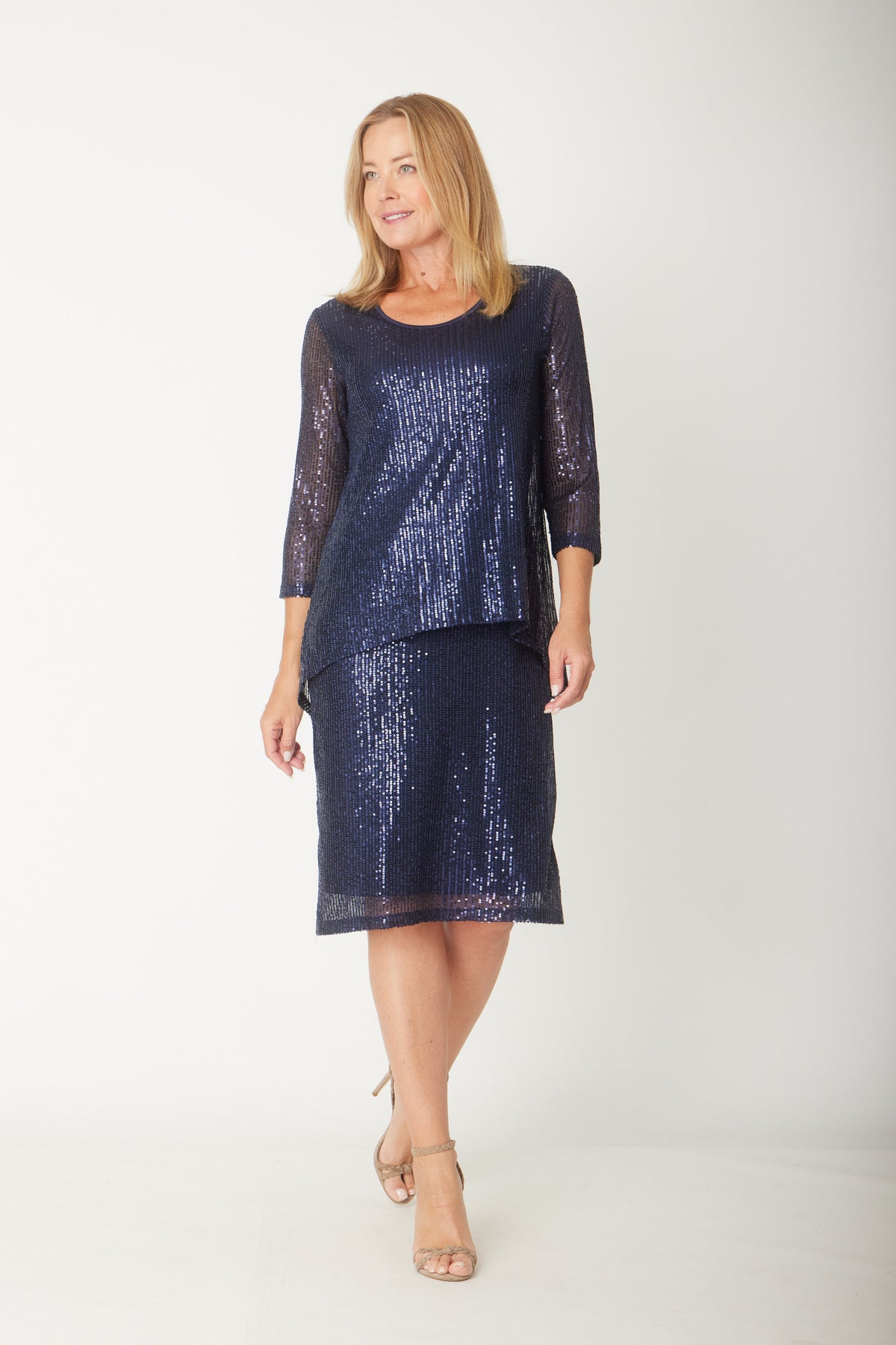 This forgiveness sequin dress features a flattering overlay that gently skims the body, enhancing your silhouette with ease. Fully lined for a smooth finish, it offers sheer 3/4 sleeves and slight stretch, ensuring comfort throughout wear. Designed without zippers, this dress combines elegance and ease, making it perfect for any special occasion.