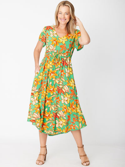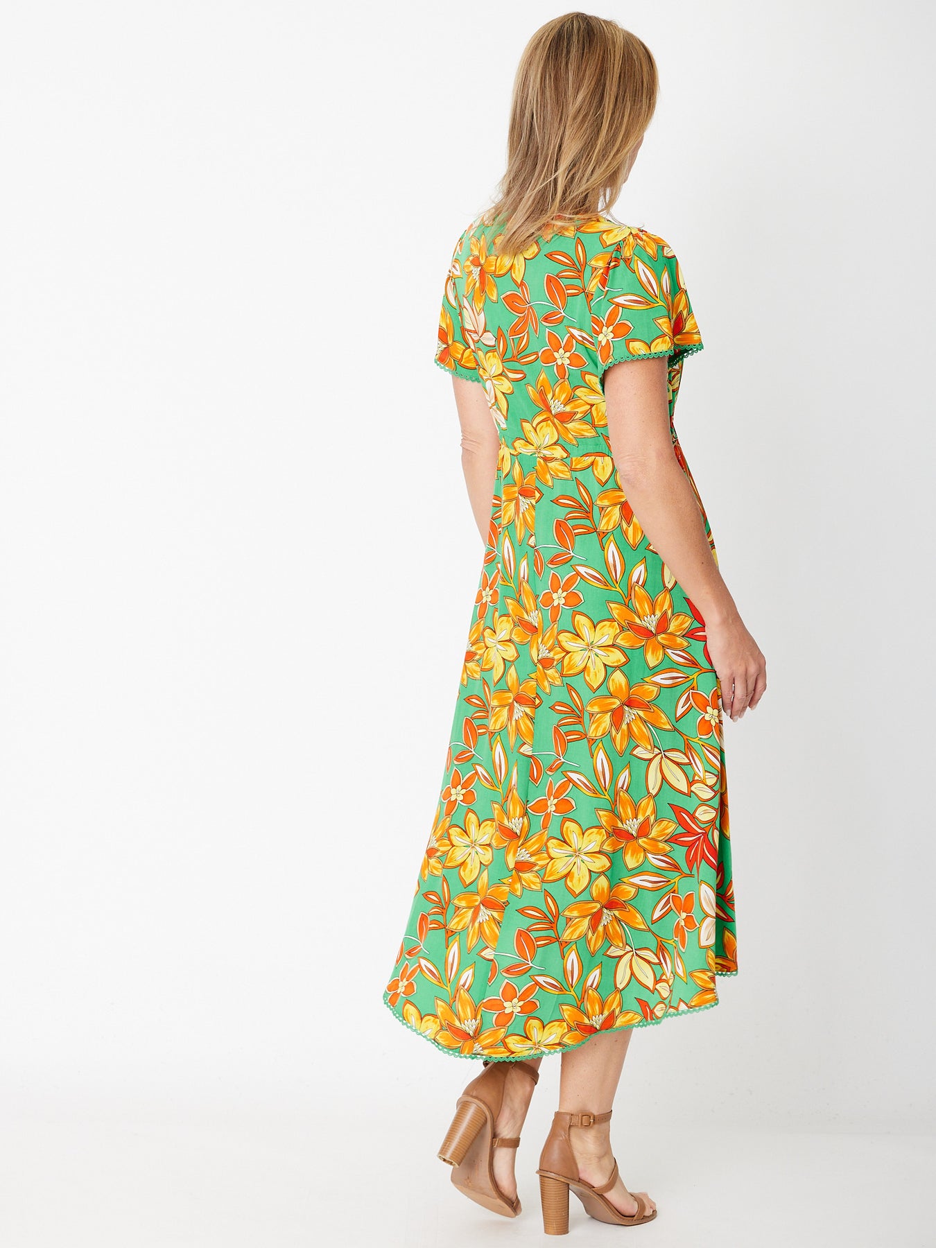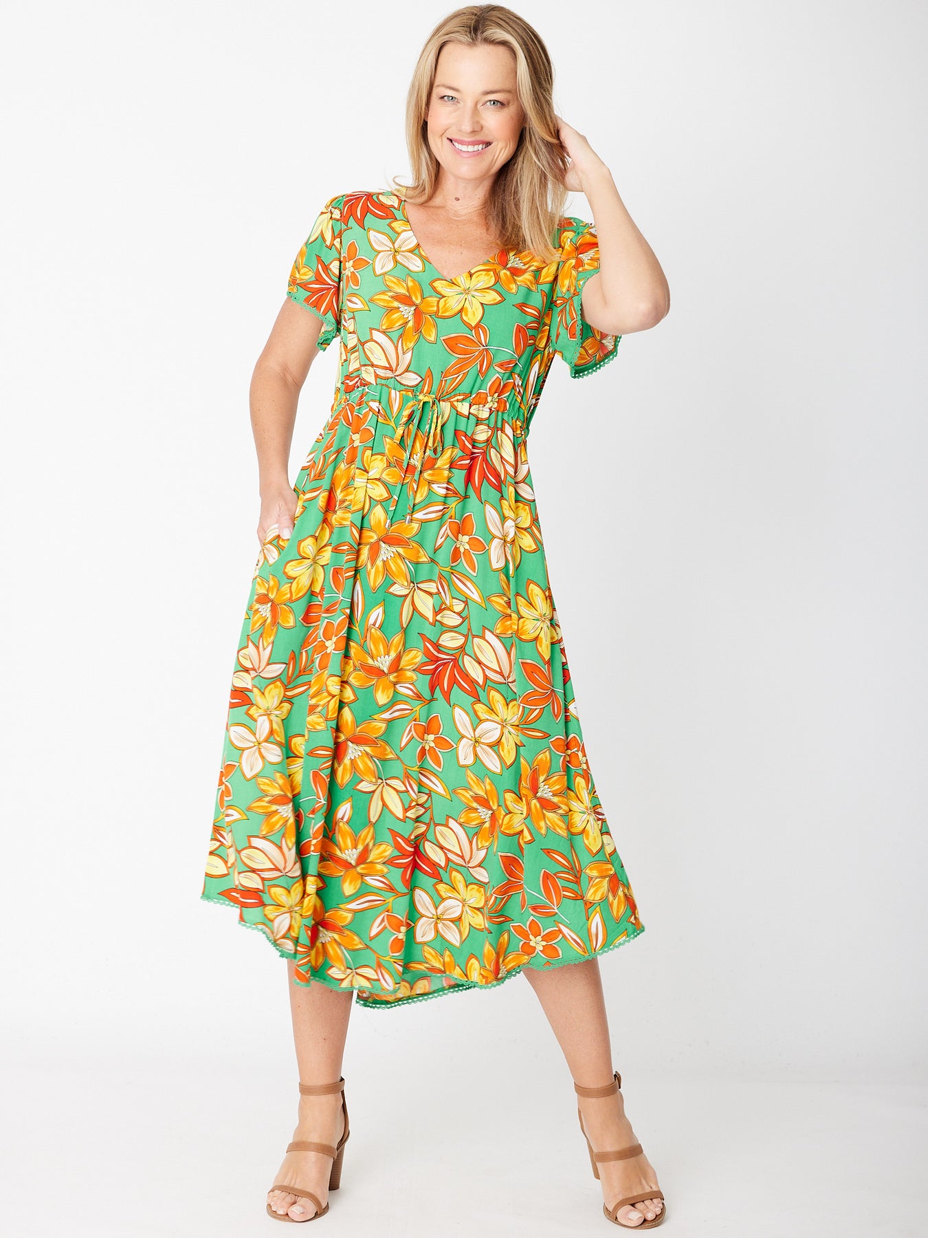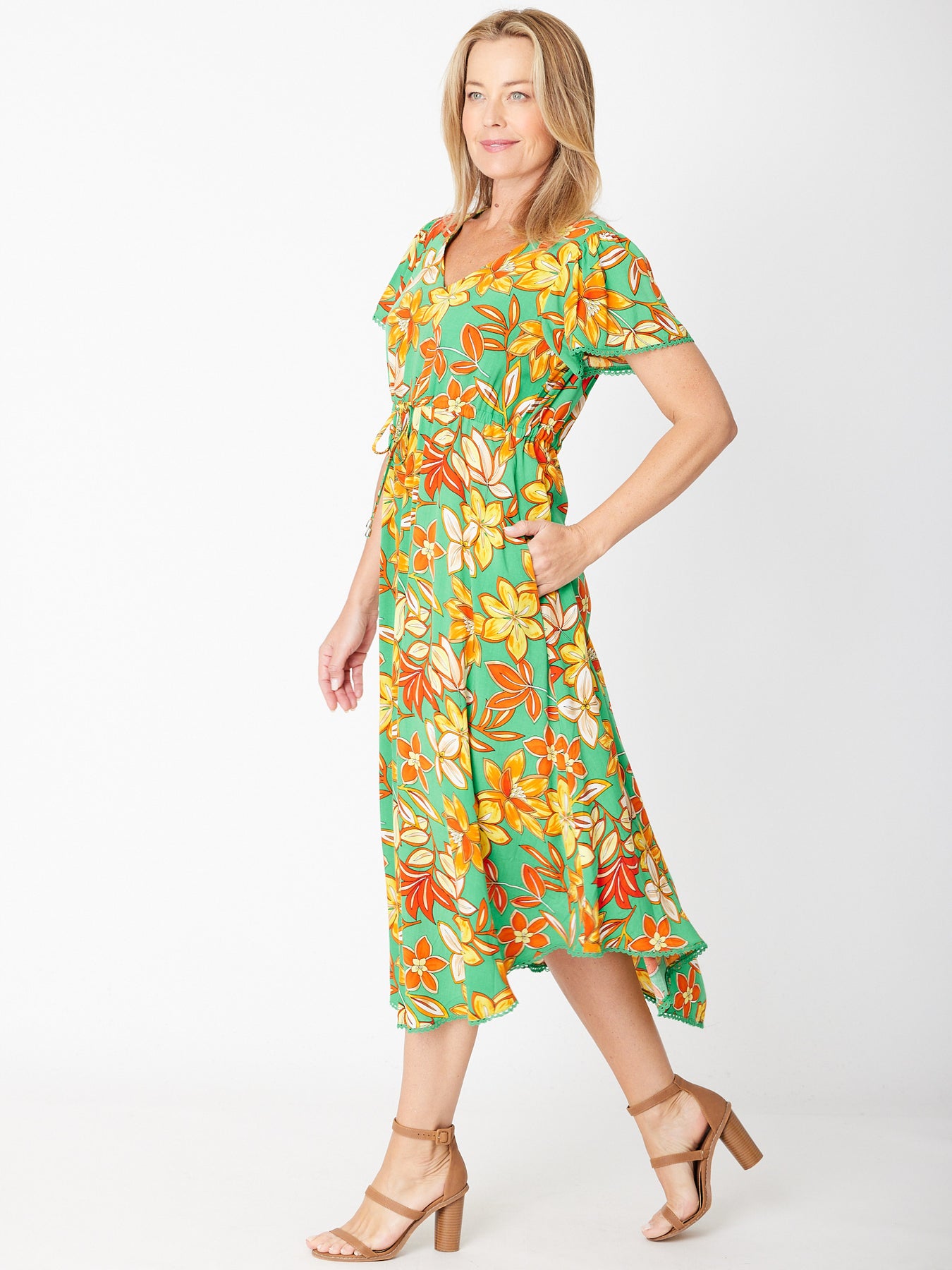 This Holiday Fun Dress combines effortless style with comfort. Featuring a flattering V-neck and delicate ruffle detailing, it draws attention gracefully. The adjustable drawstring waist allows for a personalised fit, while the cool, breathable rayon fabric keeps you comfortable all day. Floaty sleeves add a touch of femininity and freedom of movement, making this midi dress perfect for any occasion where you want to feel light and elegant.