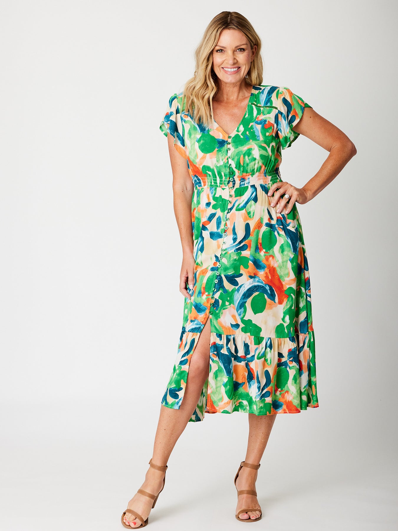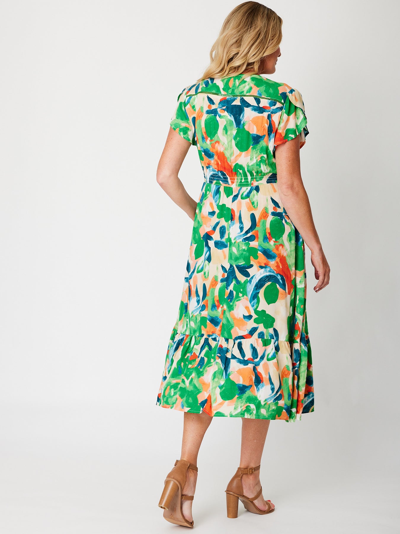 Elevate your wardrobe with the V Neck Jilly Dress—a charming piece that effortlessly combines style and comfort. This button-through design features a flattering shirred waist that defines your silhouette, while playful fluttered sleeves add a touch of feminine elegance. The decorative frill hemline creates movement and visual interest with every step. Perfect for casual outings or dressed-up occasions, this versatile green dress brings a fresh, vibrant energy to any look. A must-have staple that transitions beautifully from day to night.