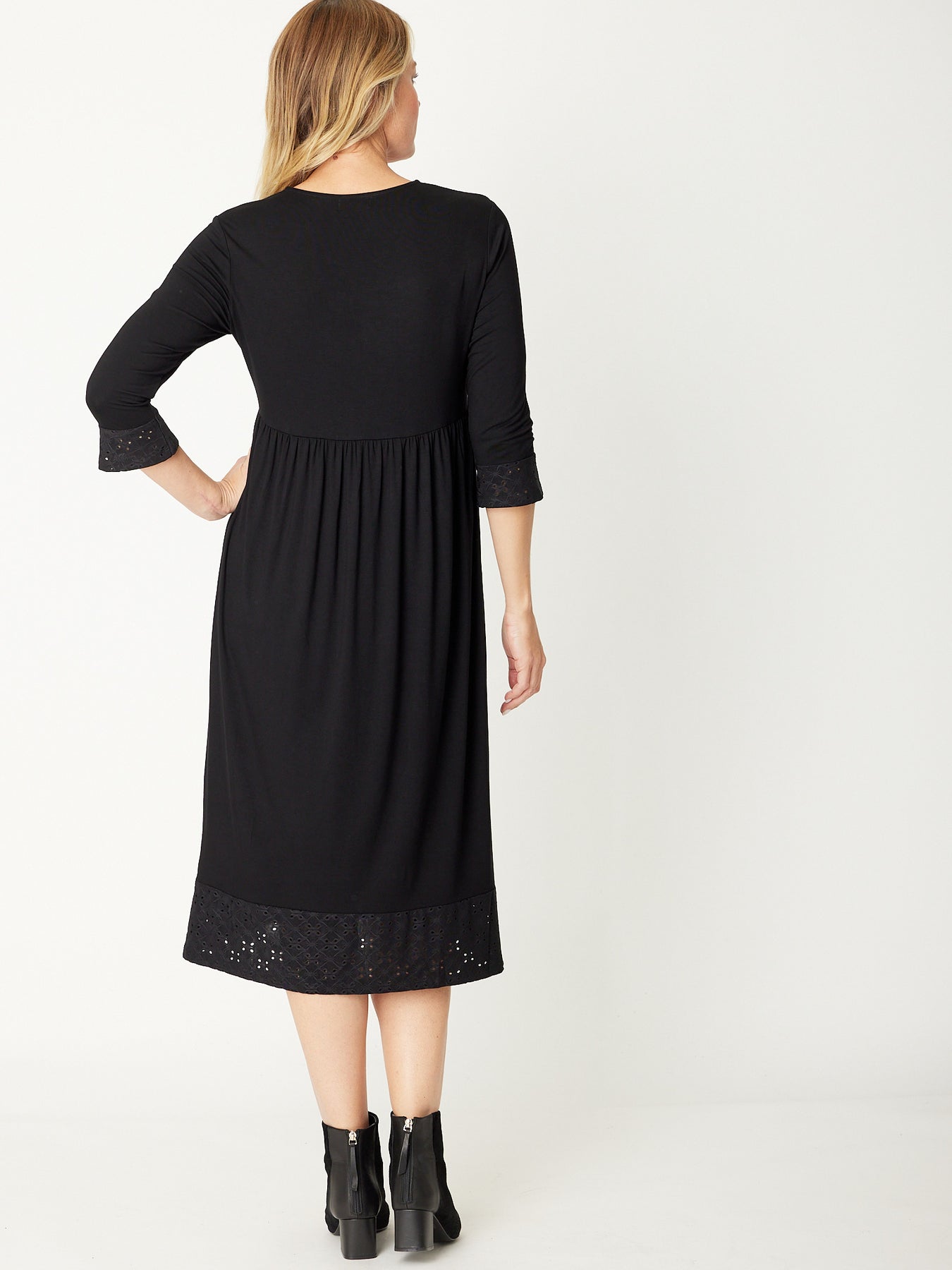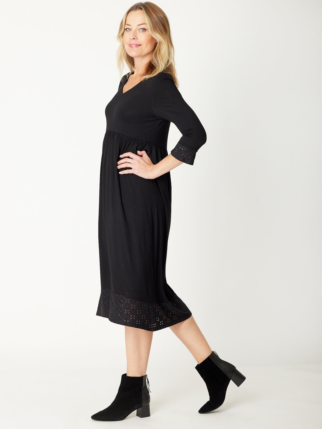 This versatile V-neck viscose jersey dress transitions seamlessly from desk to dinner with its comfortable stretch fabric, elegant 3/4 sleeves, and flattering midi length. Elevate your look with accessories and enjoy all-day comfort in a piece that's true to size and ready for any occasion.